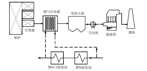 在凝結(jié)水方面,從N級低壓加熱器入口抽取一部分凝結(jié)水,進(jìn)入煙氣冷卻器后被加熱,返回至N+1級(按實(shí)際情況而定)低壓加熱器出口,從而節(jié)省低壓加熱器的抽汽,增加汽輪機(jī)的做功,節(jié)省煤耗。